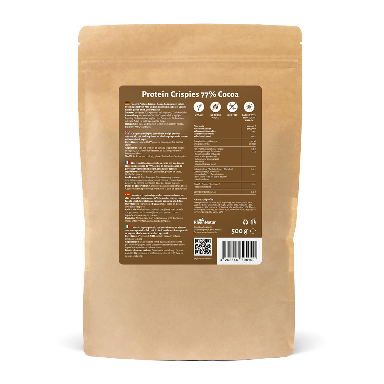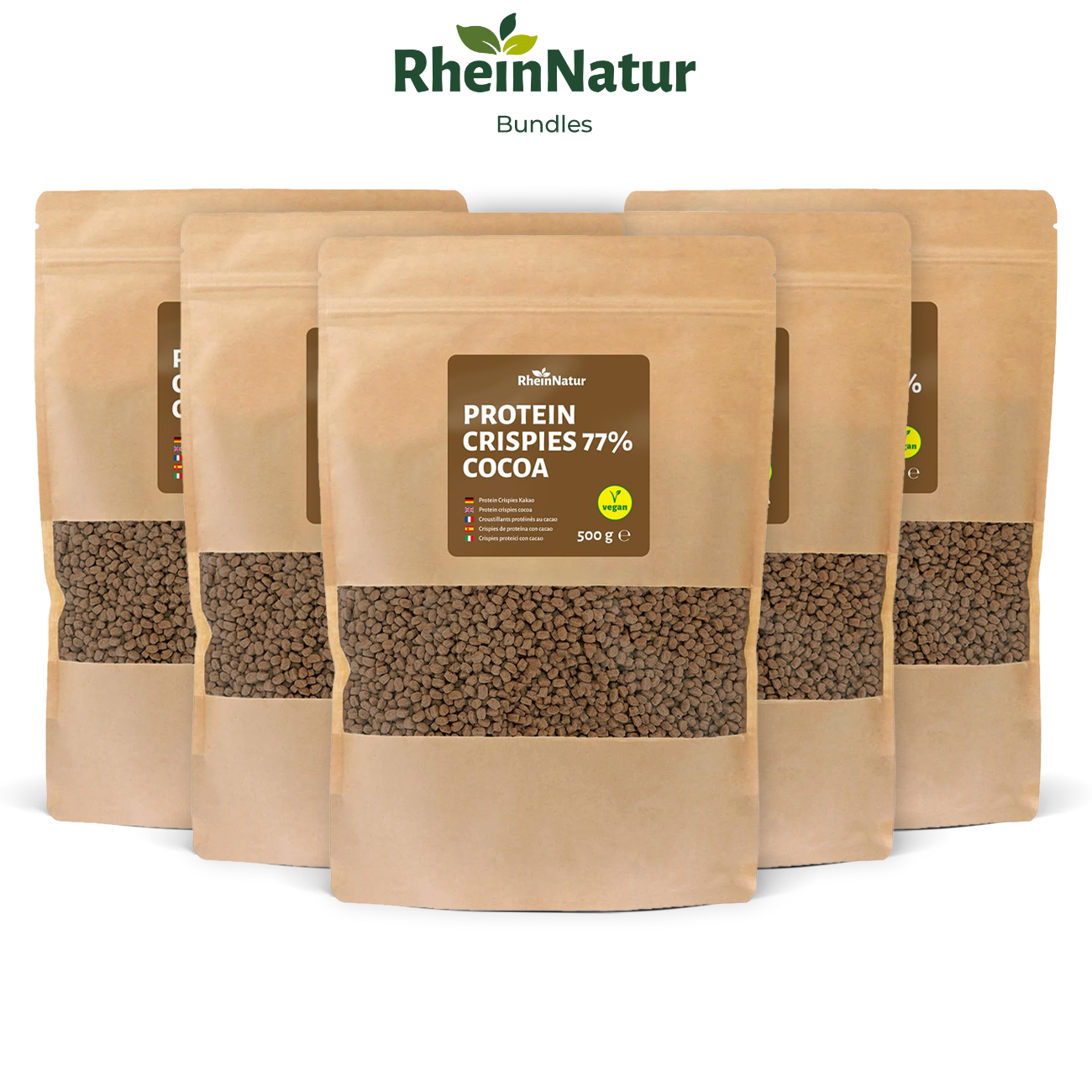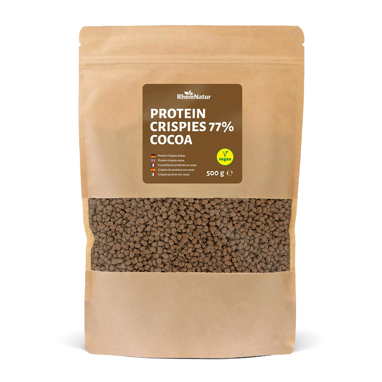RheinNatur Protein Crispies 77 % Cocoa – Vegane Protein-Crispies mit Kakao, 500 g Beutel - FAQ